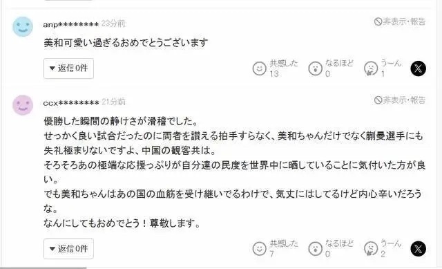 其实温瑞博还是非常尊重张本智和,赛后主动表示非常感谢对方,并且很喜欢和对方比赛。不过日本网友还是表示:“中国观众在比赛中发出巨大声响,对张本选手的干扰太过分了,每次发球时每次都起哄,指出后反而被嘲笑。礼仪太差了。让他们学会赞赏日本选手的出色表现、理解体育精神,还需要多少年呢?”
